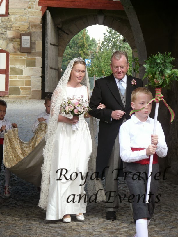 On 21. September 2013 the little town Iphofen in Franconia saw a noble Wedding when at the St Veits Church there Countess Dorothea zu Castell-Castell married Prine Heinrich XXIV. Reuß. The bride is a daughter of Count Alexander zu Castell-Castell and his former first wife Marion, née Stepp. Count Alexander is the oldest son of Fürst Albrecht and Fürstin Marie Louise zu Castell. The groom is the only son of Prince Heinrich XX. Reuß and his former first wife Baroness Elisabeth Akerhielm af Margarethelund. The groom's paternal grandmother Princess Woizlawa Reuß is a born Duchess zu Mecklenburg. The bride arrived together with her father and the walked along a street through through an old Citiy-Tower towards the Church. She wore and old train and a little diamond tiara. As train bearers and flower children acted the 3 half-brothers of the bride, Counts Gustrav, Johann and Albrecht zu Castell-Castell. The Wedding Service whiich lasted fro about 1 hour was performed be Monseigneur Gereon Rehberg. After the Wedding the bridal Couple left the Church to the cheers of some of the guests and walked again back through the City Tower.
